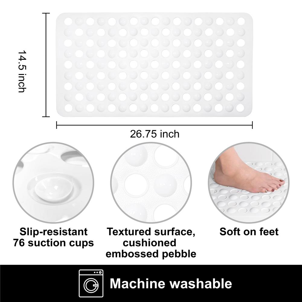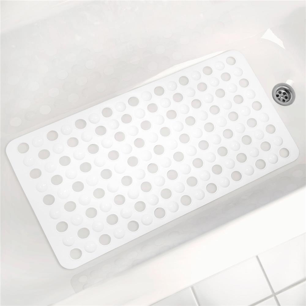 Enjoy your relaxing shower or bath without having to worry about slips or falls with the Mainstays Bubble Tub mat in White. This oblong mat with contoured corners features an embossed textural variegated pebble motif that provides a cushiony feel. It is backed with 76 skid-resistant suction cups as well as drain holes throughout that help to prevent it from moving around when used on a clean, non-textured surface. This bathmat, which provides comfort and stability, is the perfect addition to your bathroom. Made of 100% PVC. Rinse or Spot Clean when needed.