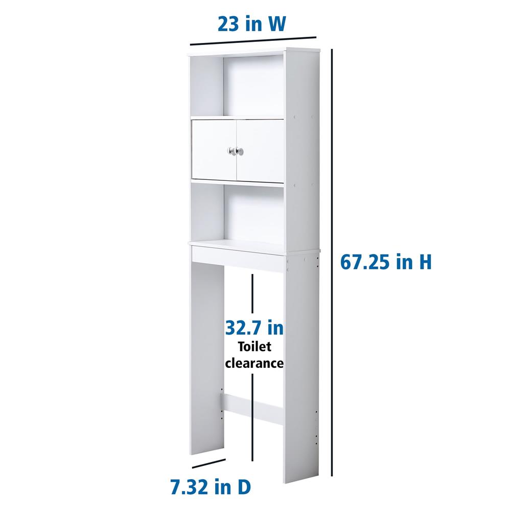 The Mainstays 3-Shelf Bathroom Space Saver cabinet creates valuable storage inside any bathroom. This storage cabinet has 3 shelves (2 open and 1 hidden) for storing bath essentials, linens and more. It is optimized to fit over most standard-height toilets (32.7 inches in clearance from the ground). It has finished edges and a moisture-resistant laminated backer for a more finished and styled look. The unit’s doors can be installed for use with the middle or top shelf to create a customized concealed storage area. Assembly is easily done by any adult, with illustrated instructions and necessary hardware included.