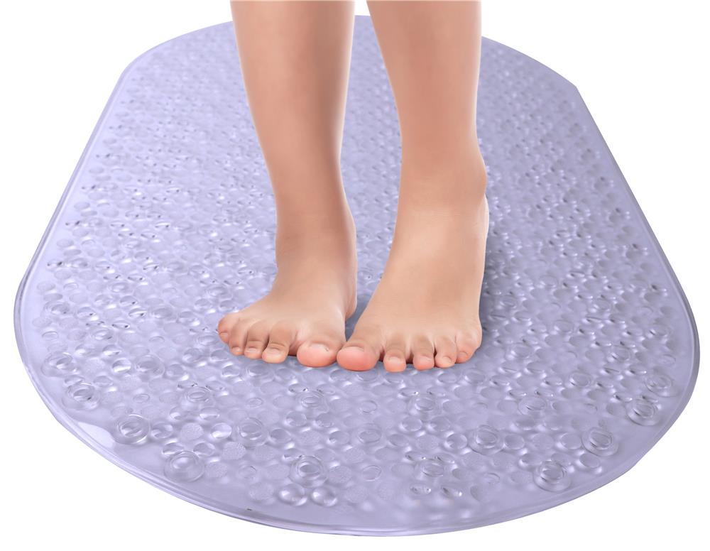 Elevate the look of your bath tub, all while adding comfort and security, with the Mainstays Oval Bubble Clear Vinyl Tub Mat. This durable mat is equipped with suction cups to keep the mat from moving around when applied to clean, non-textured surfaces. This tub mat’s bubble design provides a luxurious feel on your feet as you enjoy a relaxing shower or bath. Doubling as an understated design element, this bubble mat effortlessly pairs with any bathroom decor. The slip-resistant design provides for a more secure shower and bath experience for everyone in your home, young or old. Sized at 15.25 inches by 27 inches this mat is a perfect fit in almost all bath tubs. Cleaning is easy, too, simply machine wash and hang to dry. Enjoy the security and comfort the Mainstays Oval Bubble Clear Vinyl Tub Mat offers.