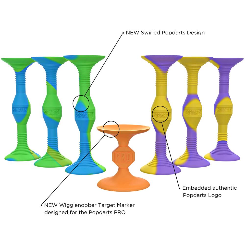 WHY CHOOSE POPDARTS? In a world that isolates us with devices, we bring you a game that brings friends and family of all ages together, fuels creativity and challenges abilities! WHAT’S INCLUDED IN A SET? 3 Blue/Green Swirled Popdarts | 3 Purple/Yellow Popdarts | 1 Orange Wigglenobber Target Marker | 1 Mesh Carrying Bag with rules printed right on the bag. WHERE CAN I PLAY? Our compact sets can be played wherever you go, indoors or outdoors. Popdarts stick best to smooth surfaces like a countertop, refrigerator, window, car windshield, glass door, surfboard – be creative! HOW DO YOU SCORE? The closest Popdart to the Target Marker = 3 points. Every other Popdart that sticks = 1 point. Landing on the Wigglenobber Target Marker = 10 points.Use “Cancellation Scoring” (just like cornhole). For example: 5 blue – 2 green = 3 blue. Each game consists of multiple rounds! First team to reach 21 points wins!