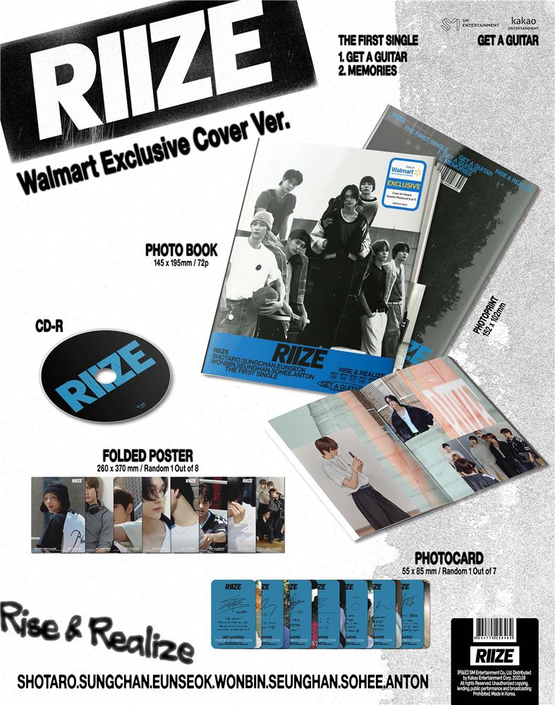‘Riize’ is the newest addition to Powerhouse Korean Entertainment company SM Entertainment’s roster. Their debut single ‘Get A Guitar’ shows the seven members becoming one through music and their shared dreams. ‘Get A Guitar’ will be available in 2 versions: Rise Ver. & Realize Ver. Contains a *Photobook, *CD-R, *Folded Poster (Random 1 of 7), and Walmart-Exclusive Photocard inside (Random 1 of 7). *Walmart Exclusive Cover Ver. Has Realize version assets. *The Walmart Exclusive Version’s photocards are different from the Walmart Exclusive Cover Version photocards.