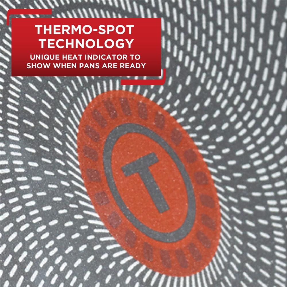 - THERMO-SPOT TECHNOLOGY: Unique heat indicator that turns solid red to show when pans are properly preheated to start cooking