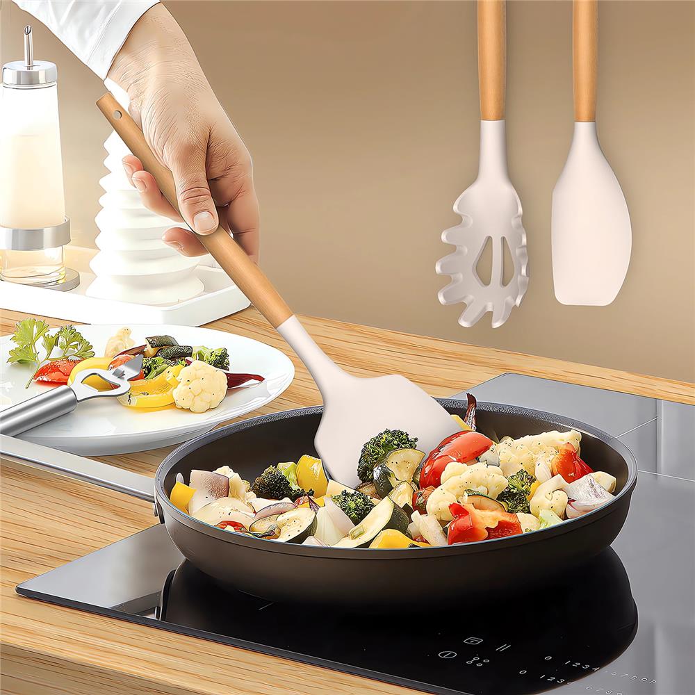 - HEAT-RESISTANT, NON-MELTING, WOODEN HANDLE – Silicone cooking utensils set are heat-resistant up to 446°F, ensuring they won’t melt or produce smoke even in high-temperature frying. The comfortable wooden handle prevents heat transfer, providing a safe cooking experience. This is the go-to basic cooking set for a new home or apartment. Please note that each wooden handle has a slightly different color and texture.