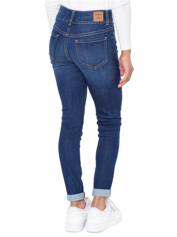 These are the perfect addition to your wardrobe Celebrity Pink Girls Girlfriend Mid Rise 2-Button Double Roll Cuff Ankle Skinny with Super soft stretch denim in Dark denim wash featuring Ankle skinny fit with 2 button waistband and a Rolled cuff hem,25 in inseam unrolled, 23 in inseam rolled. Pair these with your favorite sneakers and crop top or tee for a head to toe head turning look!