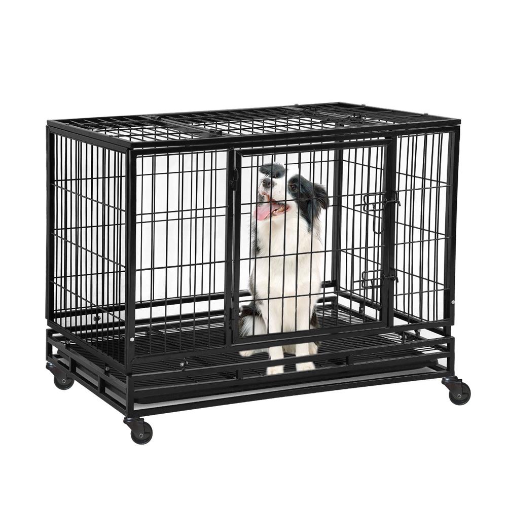 42 Inch Large Dog Crate Dog Kennel Indoor Outdoor Big Dog Cage Dog Crates for Large Medium Small Dogs Heavy Duty Dog Crate Metal Indestructible XXL XL Dog Crate Pet Cage with Wheels Tray Double Door