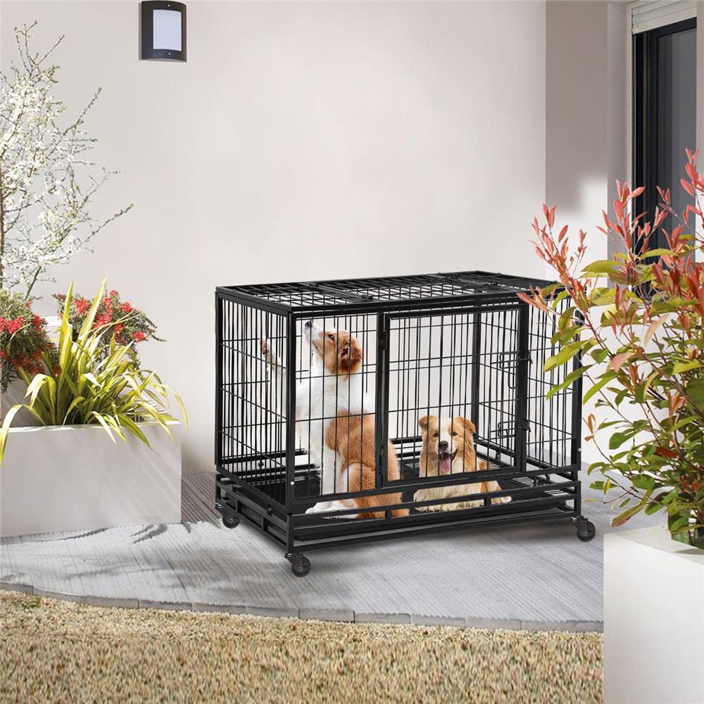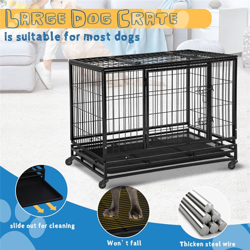 Top and front door design of our large dog crate make it easier to access and feed your dogs. Heavy duty dog crate double bolt securely lock door providing your dog with a safe pet home, avoid damage or injury. Outdoor indoor dog kennel large uses steel tubes and wires to make the structure stable, indestructible and durable. Large dog kennel features multi-layered non-toxic coating that resists rust and keeps dogs healthy, suitable for most small medium and large dogs. Extra large dog crate removable bottom tray can easily slide out for convenient cleaning. The xxl dog crate infill metal mesh platform allows your dog to stand firm. It only takes about 10 minutes to set up the 48 inch dog crate. Dog crates for large dogs can be folded up and stored away. The xl dog kennel 360-degree rolling casters allow you to easily move and two lockable casters can be locked to keep it stable in place. Indestructible dog crate provide quality assurance. Please contact us if you have any questions about our large dog cage and we will respond within 24 hours with a satisfactory solution.