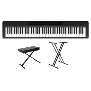 The Yamaha P-143 digital piano features 88-key Graded Hammer Compact (GHC) keyboard action and a quality, stereo-sampled grand piano Voice, making it an ideal choice for beginners, students and hobbyists. The GHC keyboard action uses weighted keys to replicate the acoustic piano experience, with a compact design that saves space without sacrificing authenticity. The P-143…
